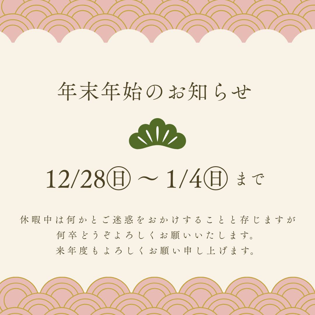 2025年12月10日 / 最終更新日 : 2025年12月4日 nishimura おしらせ 年末年始休業のお知らせ 上記期間中【12/28㊐~1/4㊐】はお休みとさせていただきます。 モデルハウスもお休みとなります。 年始は1/5㊊より営業いたします。 休暇中は何かとご迷惑をおかけすることと存じますが 何卒どうぞよろしくお願いいたします。