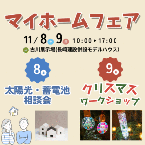 2025年10月31日 / 最終更新日 : 2025年12月17日 nishimura 新築イベント情報 11/8㊏9㊐太陽光・蓄電池相談会&クリスマスワークショップを開催!【予約制】 11/8㊏9㊐長崎建設併設の古川展示場にて2日間にわたり見学会とイベントを同時開催します! 【時間】10:00~17:00 【場所】古川展示場(長崎建設併設のモデルハウス) イベントは【予約制】です。 8月にOPENした […]