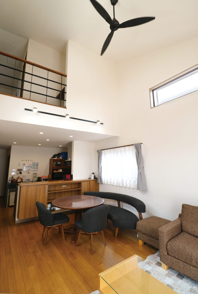 吹き抜けのある開放的なLDKは、家族が自然と集う心地よい空間。無垢材の床のぬくもりに、2階の黒アイアン手すりが映え、ナチュラルながらも洗練された印象に。