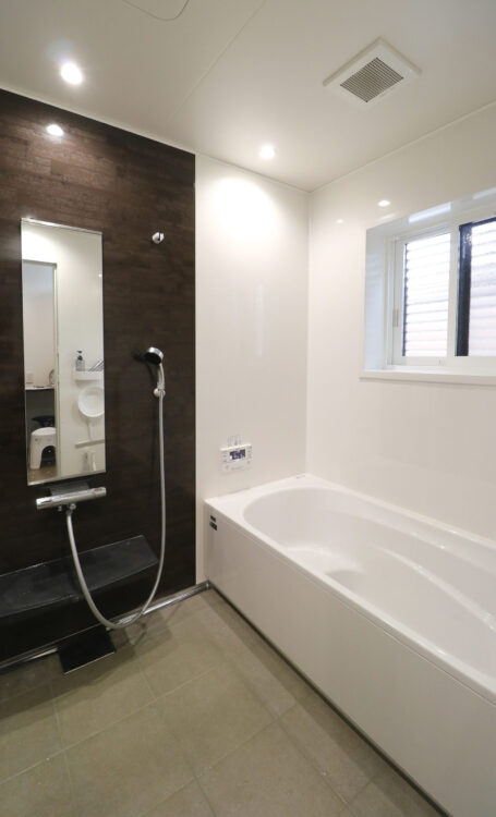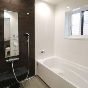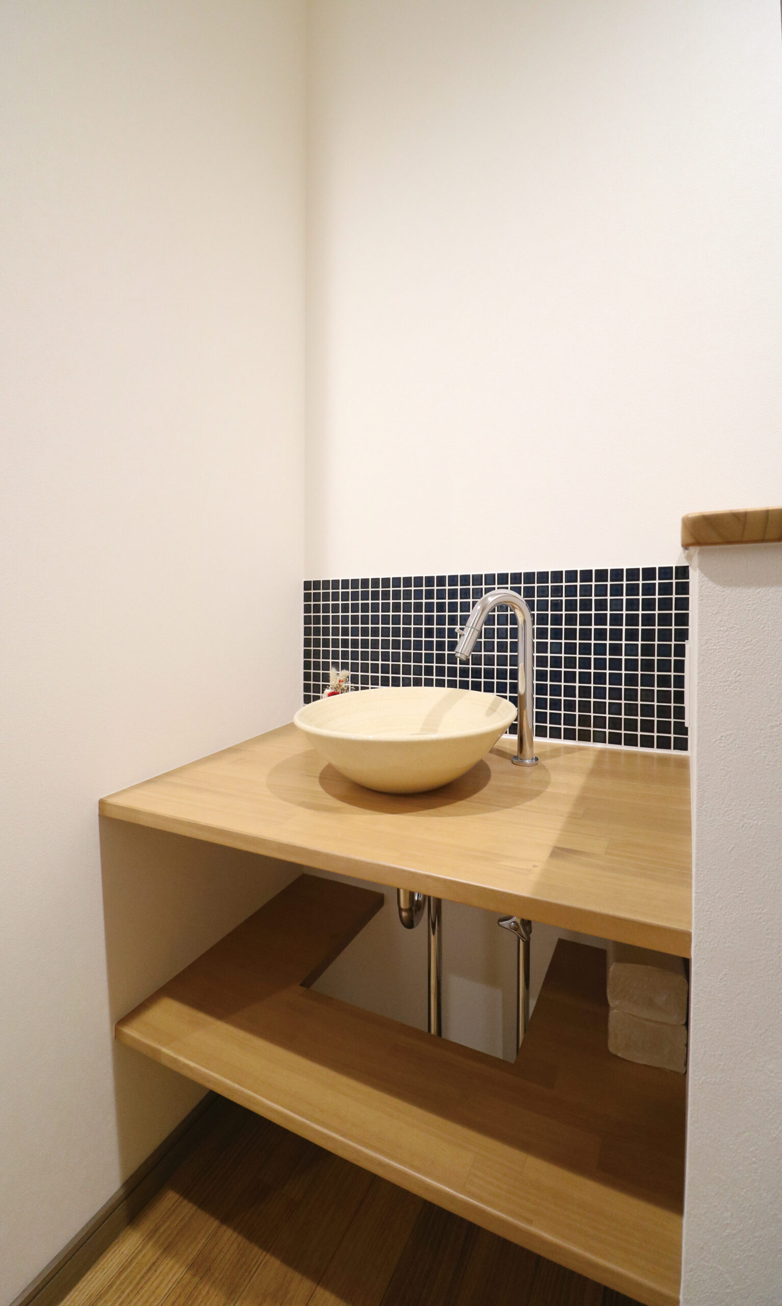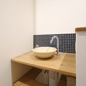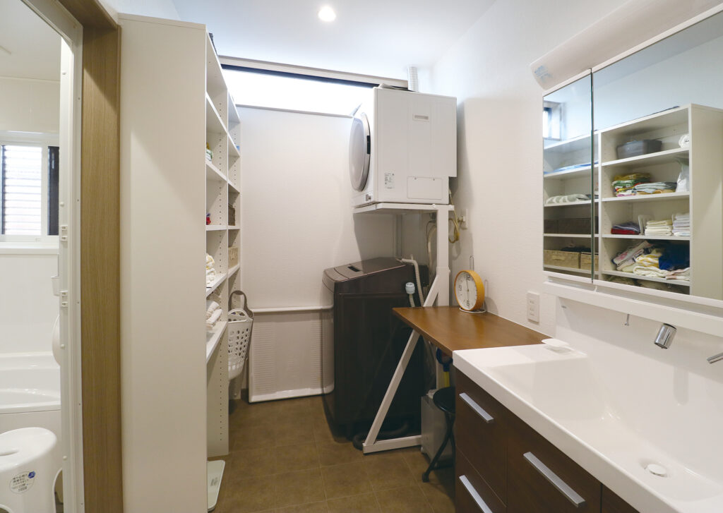 洗面所にはガス乾燥機「乾太くん」と作業カウンターを備え、洗濯→乾燥→たたむ動作が一か所で完結し、家事負担が軽減されます。収納もたっぷりで、機能的な設計が魅力です。