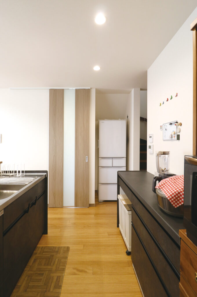 キッチン背面の壁は、マグネットがくっつく仕様で壁に穴をあけることなく書類を飾れて便利。階段下の空間に冷蔵庫を置くことで、よりキッチンがすっきりとした印象に。