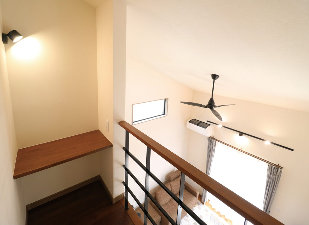 2階には、吹き抜けに面したカウンターを設置。ワークスペースや読書コーナーとして活用できる、使い勝手の良いミニ書斎に。